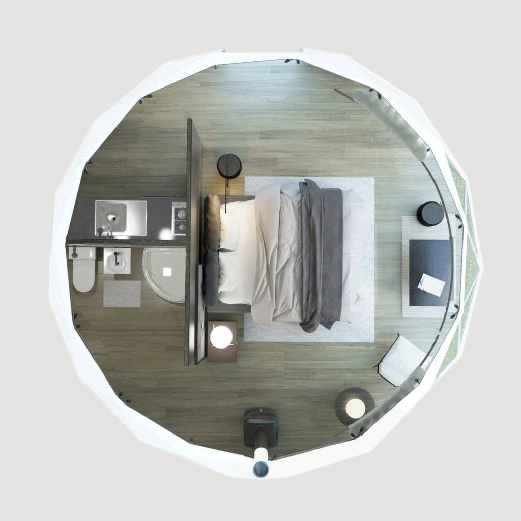 The 5m Stargazer – Element is a Luna pre-configuration with all the core components to build out a comfortable one bedroom or office geodesic dome.